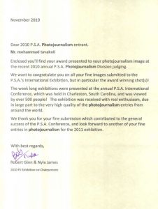 2010’da İran’ın basın festivalinde haber fotoğrafçılığında ikincilik